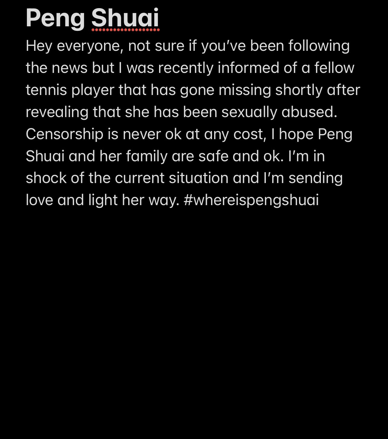 Supporters who are worried about the 35-year-old players safety have rallied online using the Twitter hashtag WhereIsPengShuai. Peng Shuai should be heard not censored.